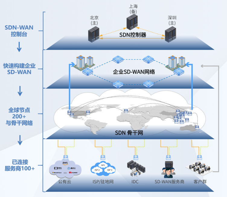 是指將SDN技術應用到廣域網場景中所形成的一種產品或服務。這種產品或服務用于連接廣闊地理范圍的企業網絡、數據中心、互聯網應用及云服務,旨在幫助用戶降低廣域網的開支和提高網絡連接靈活性。